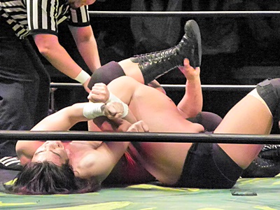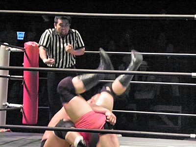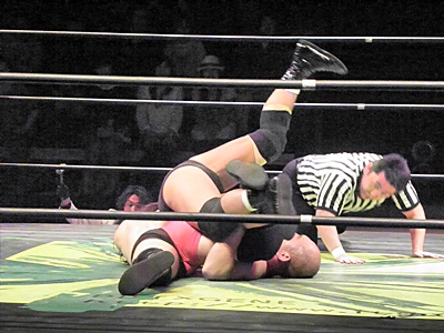 高岩パワーボム狙う、佐々木回転エビ固めに(左写真)、カウント2。