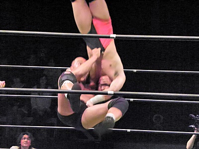 そして雪崩式ブレーンバスター(左写真)、カウント2。