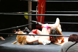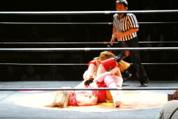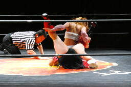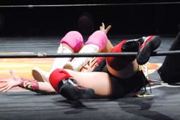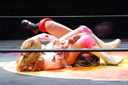 宮崎が体をひねって逃げようとするとチェリーは裏十字に(右写真)、宮崎ロープ。
