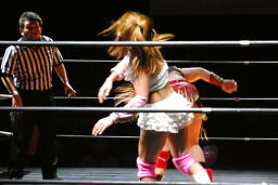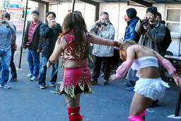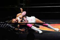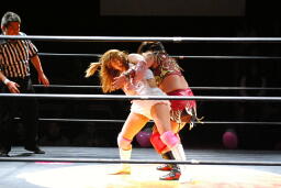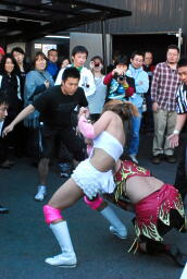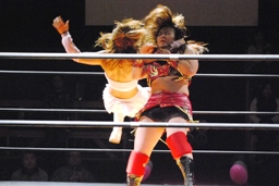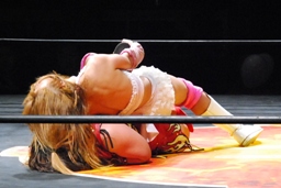 チェリーがひな壇でのブレーンバスター狙うが宮崎切り返す(右写真)。