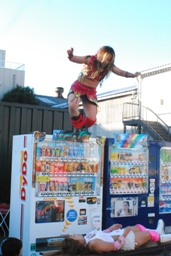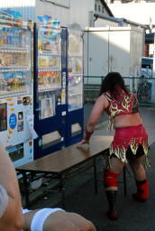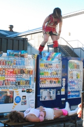 見事なダイビングボディプレスfrom自販機(右写真)。