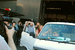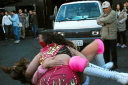 トラックの上で殴り合い(左写真)。
