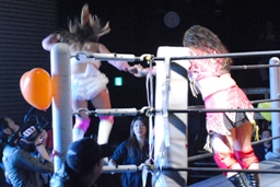 一旦リングに戻るが宮崎の腕を取るとトップロープから場外ダイブ、その勢いで宮崎の腕をトップロープに叩きつける(左写真)。