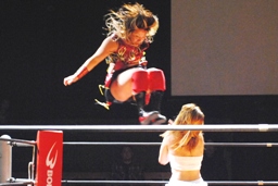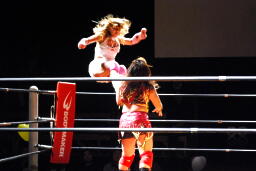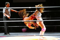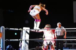 宮崎張り手でダウンさせると顔面へのドロップキック、カウント2。ボディスラムからコーナーに上ってミサイルキック(左写真)、カウント2。