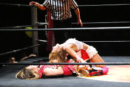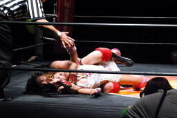 チェリーは宮崎の腕めがけてミサイルキック(左写真)、カバー、カウント2。