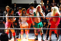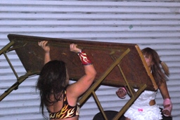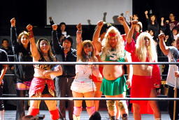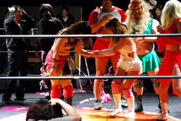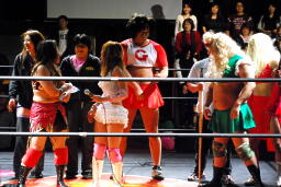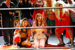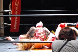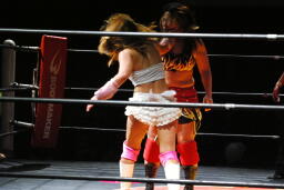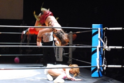 宮崎はエプロンのチェリーを飛び越える形で回転エビ固め、場外に着地するとパワーボムでチェリーを叩きつける。さらにチーズスター。テーブル、イスを投げつける(右写真)。