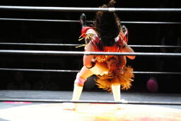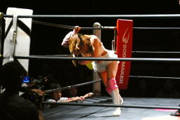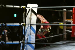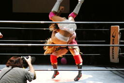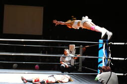 宮崎ボディスラムからコーナーに上ってムーンサルトプレス、チェリーはヒザを立ててブロック(右写真)。