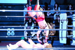 チェリーコーナーに上る、宮崎立ち上がって下からパンチ、チェリーは腕をキャッチ、そのままフットスタンプで押しつぶす(左写真)、カウント2。