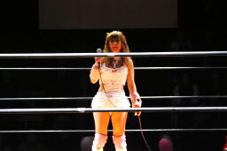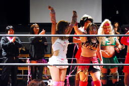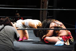 チェリーがマイクを取る(左写真)。「女子初の60分アイアンマンマッチ、もう引退されてしまう宮崎さんと誰にも邪魔されず60分思い切り闘えると思って楽しみにしてたけど、やっぱりリングに中は厳しくて。こんなに強い宮崎さんがもうまもなく引退してしまうかと思うとさみしくてたまらないです。まだまだ教わりたいことがたくさんあります。宮崎さん、自分が60分やりたいって言った時に名乗りを上げてくれてありがとうございました。今日はプレッシャーもいっぱいあったけど、こんなにたくさん皆さん集まってくれてどうもありがとうございました。今日闘ってみて今から自分が何をしないといけないということがよくわかりました。これから練習、試合頑張ってファンタジーイリュージョンもまた開いていきたいと思いますのでまた来て下さい。今日はありがとうございました。」
