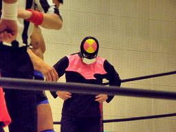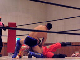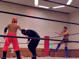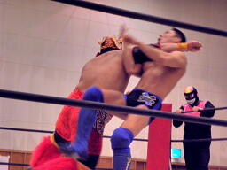 不審者マンリングイン(左写真)。ロックアップ、不審者マンがヘッドロック、シーサー王ロープに振る、ショルダーブロックの打ち合いはシーサー王の勝ち。シーサー王ロープに飛んでエルボー。