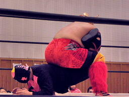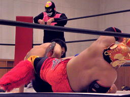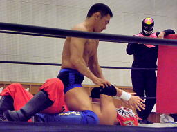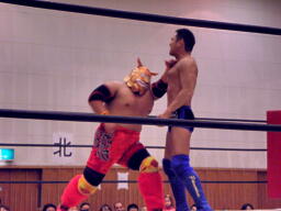冨宅と不審者マンダブルのエルボー、ダブルのブレーンバスターに行くがシーサー王は切り返す(左写真)。