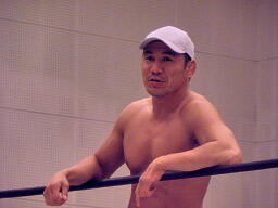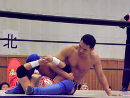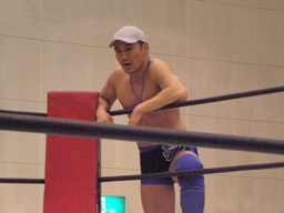 シーサー王リリースしてエルボードロップ(右写真)、カバーは冨宅がカット。シーサー王は神威にタッチ。