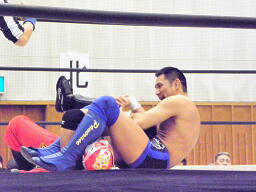 先発は冨宅と神威。手四つ(左写真)から冨宅がローキック。神威タックル、冨宅かわしてバック取る、神威切り返す、冨宅腕をひねる。神威回転して切り返すとハンマーロックに。