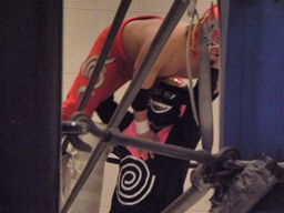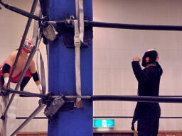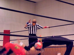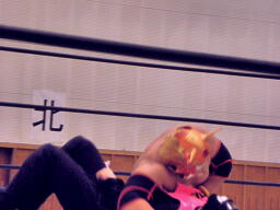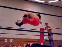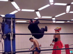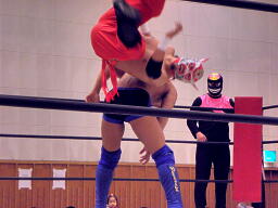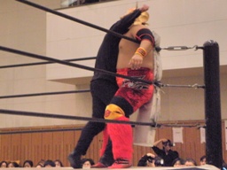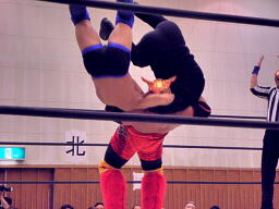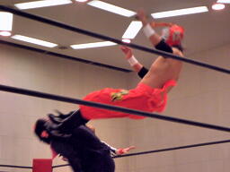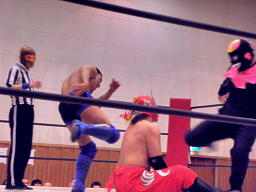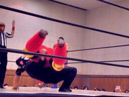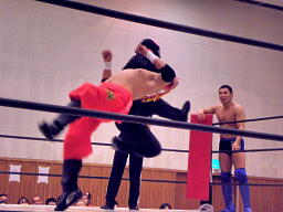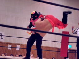 シーサー王パワーボムの体勢、冨宅リバース、不審者マンにタッチ。シーサー王も神威にタッチ。神威ゼロ戦キック、コーナーに振って串刺しニーアタック、コーナーに上ってミサイルキック(右写真)、カウント2。