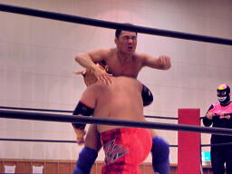 冨宅ロープに飛ぶ、シーサー王キャッチしてマンハッタンドロップ(左写真)。