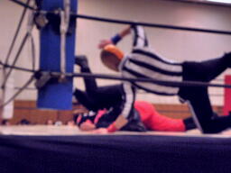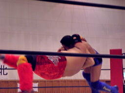 不審者マンボディスラム狙うが潰れる(左写真)、カウント2。シーサー王は神威にタッチ。5分経過。