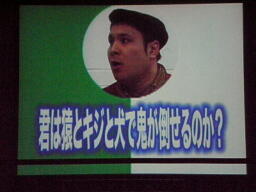 例えば桃太郎が鬼退治に行くが、猿とキジと犬で鬼が倒せるか?と力説(左写真)。