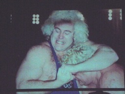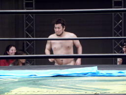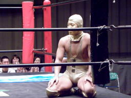 懐かしのキング・ポコダのコスチュームに身を包んだ高梨が川と思われるブルーシートをセッティング、リングに座る(右写真)。