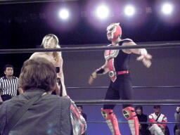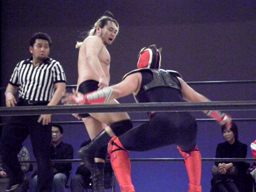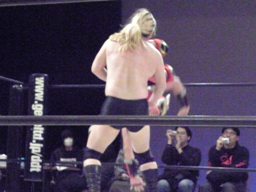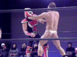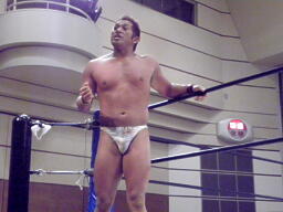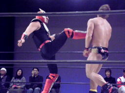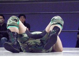 大家はプロテクターをめくってエルボー(右写真)、これは効いた。大家ロープに飛ぶ、HERO!カウンターのドロップキック狙うが大家はスカす。