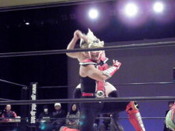 コーナーに振って串刺しラリアット(左写真)、ボディスラムからテディベア、カウント2。