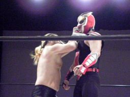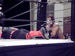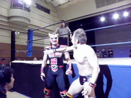 HERO!ソバット打ち込んで回転エビ固め、マイケルはこらえ、HERO!のマスクを剥ぎとって押さえつける(右写真)、カウント3。