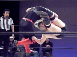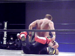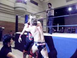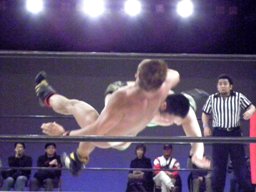 大家ブレーンバスターを狙うがHERO!あっさり切り返す(左写真)。しかし大家カバー、カウント1。なんか凄い。さすがレジェンド。3分経過、残り試合時間2分。