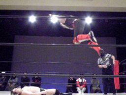 大家コーナーに振って突っ込む、HERO!かわしてドロップキック(左写真)。