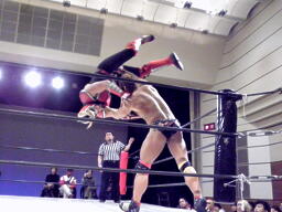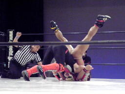 しかしHERO!はエルボーをかわして逆さ押さえ込み(右写真)、カウント2。