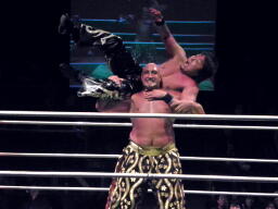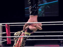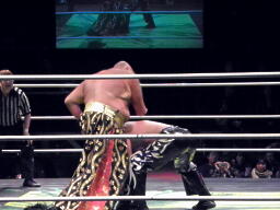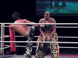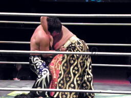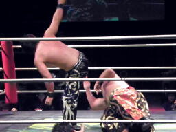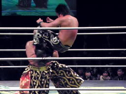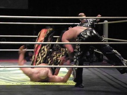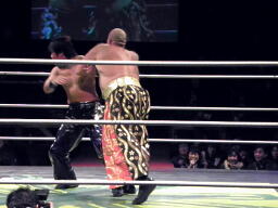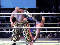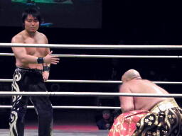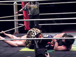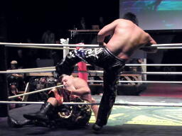 星誕期ラリアット(左写真)、カウント2。星誕期ノド輪落とし狙う、HARASHIMAブロック。星誕期は場外に押し出す。