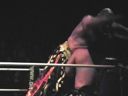 HARASHIMAをボディスラムで投げてコーナーに上がるが足が痛んで飛べない(左写真)。