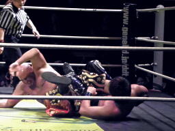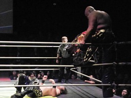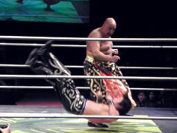 星誕期逆にブレーンバスター、HARASHIMA背後に着地して子泣きクラッシュ(右写真)。