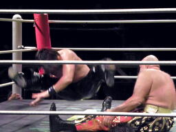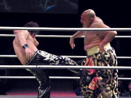 HARASHIMAローキック(左写真)、星誕期ヒザを着く。