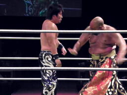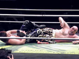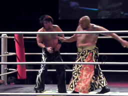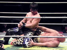 HARASHIMAレッグロック(左写真)、星誕期はキックでブレーク。両者立ち上がる。