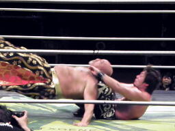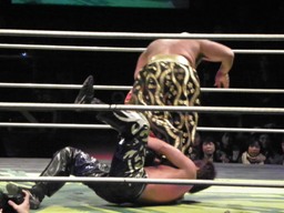 HARASHIMAエプロンに出てスワンダイブプレス(左写真)、カウント2。