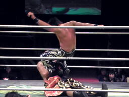 HARASHIMA星誕期の足を踏み台に延髄蹴り(左写真)、カウント2。