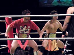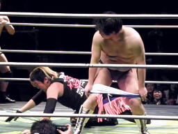 MAZADAフェースロック(左写真)からチキンウィング、高梨返そうとするがMAZADAロープは返させない、NOSAWAにタッチ。