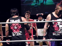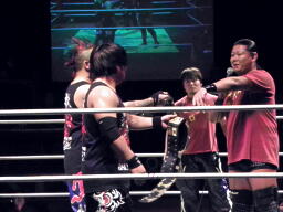 そこにHARASHIMAのテーマ、挑戦者としてDISASTER-BOXが名乗りを上げる(右写真)。HARASHIMA「これ以上DDTのベルトが流出するのは見逃せない!」