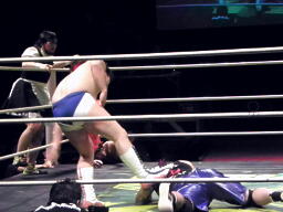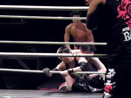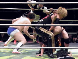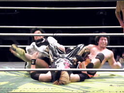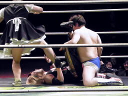 精神的ダメージを負ったFUJITAを首固め(右写真)、NOSAWAとMAZADAがカット。