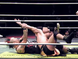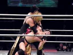 FUJITAツームストンドライバー狙う、高梨背後に着地して逆さ押さえ込み(左写真)、カウント2。