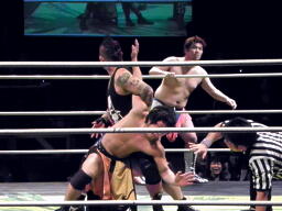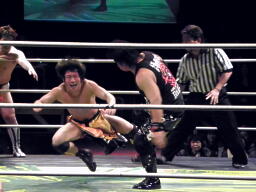 FUJITA卍固め、またもディーノが尻にタッチ(左写真)。FUJITAはNOSAWAにタッチ。