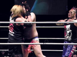 しかしかえって欲情したディーノはさらにキスを迫る、FUJITAブロック、後ろからNOSAWAがディーノに一撃、その勢いでディーノはキス(右写真)。
