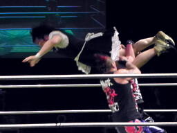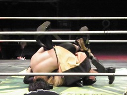 高梨トラースキック、ロープに飛ぶ、FUJITAアックスボンバー(右写真)、カウント2。