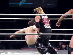 NOSAWA[リングイン、ダブルでロープに振る、高梨はMAZADAにハネ上げられたのを利用してNOSAWAにドロップキック(右写真)、さらにMAZADAに延髄蹴り、ディーノにタッチ。