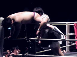 高梨コーナーに詰めてパンチ連打(右写真)、ストンピング連打。FUJITA体勢を入れ替えてターンバックルに高梨をぶつけるとMAZADAにタッチ。