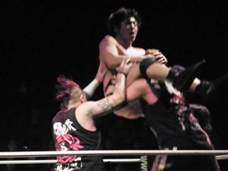 MAZADAラリアット、ロープに飛ぶ、佐藤水車落とし(左写真)、カウント2。佐藤ビクトル投げ狙うがMAZADAブロックしてDDT。