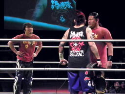 ディーノはFUJITAを見ながらNOSAWAにパンチ(左写真)。MAZADA入ってダブルのクローズライン、ディーノかわしてダブルの男色スクリュー。たまらずFUJITAが入る。