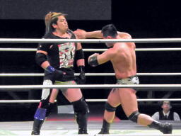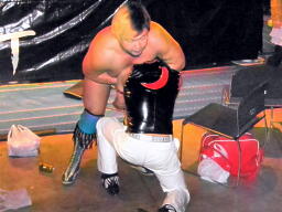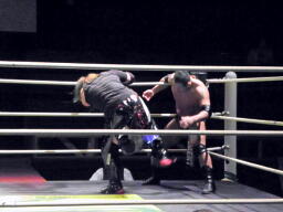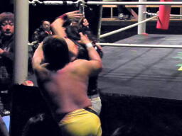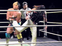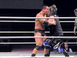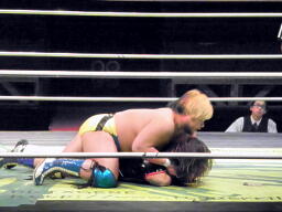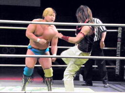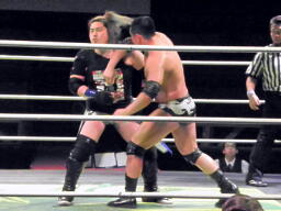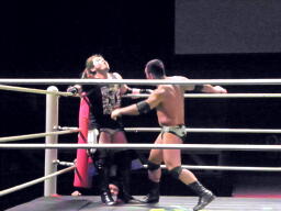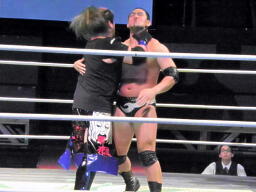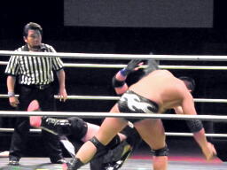 ロックアップ(右写真)、谷口がロープに押し込む、ブレーク。再度ロックアップ、今度はポンドがロープに押し込む、サミング。谷口「真面目にやれ!」