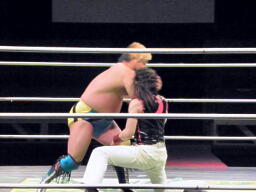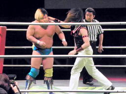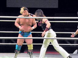 松永体重を掛ける(右写真)、凛音なんとか脱出。松永は凛音を場外に投げ出す。