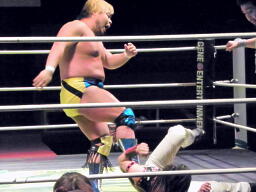 ポンドパンチ、首投げからスリーパー(左写真)。サミングからキャメルクラッチ、またサミング。リリースしてエルボードロップ。