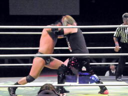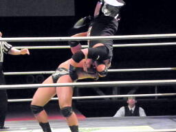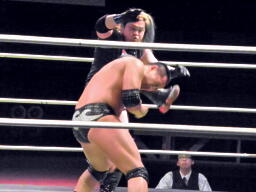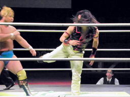 松永背中にキック(左写真)、凛音場外に。またブレーンバスターをブロック、松永リングに戻す。